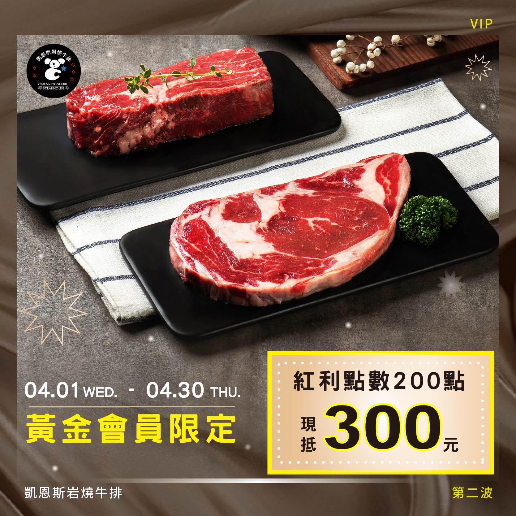 【凱恩斯】四月紅利點數放大術 發佈日期: 2026-03-302026-04-07 作者: chole 🔥 四月限定|紅利點數放大術 🔥 VIP紅利點數200點可以現抵300元 活動時間 2026.04.01(三)~2026.04.30(四) 活動說明 1.本活動為限時優惠活動,以當日消費現抵使用,無法兌換成實體折價券 2.紅利點數200點可現折300元;400點可現折600元;以此類推